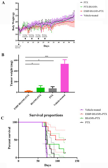 3.6. ESBP-BSANPs-PTX Inhibited Tumor Growth In Vivo and Prolonged Survival Time