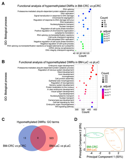 Epigenetic signature of brain metastasis from CRC and LuC tumors. (A,B) Differentially methylated regions (DMRs) between metastatic and primary tumors were analyzed and annotated using Gene Ontology (GO)-biological process tool. Graphs show the top 20 identified signatures. (C) GO terms relative to hypomethylated DMRs (i.e., activated signatures) in brain metastasis compared with primary tumors were compared using a VENN diagram. (D) Principal Component Analysis (PCA) of the methylome of brain metastases from CRC and LuC tumors. The variance explained by the first two components is shown in brackets. pCRC, primary CRC; BM-CRC, brain metastasis from CRC; pLuC, primary lung cancer; BM-LuC, brain metastasis from lung cancer.