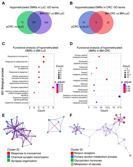 Identification of tumor-type specific epigenetic signatures of brain metastasis. (A,B) DMRs associated with the tumor-type were identified in primary and metastatic cancers and functionally annotated using GO. Then, VENN diagrams were used to identify shared activated signaling (i.e., hypomethylated DMRs) in LuC (A) and CRC (B) neoplasms. (C,D) DMRs selectively hypomethylated in BM-LuC (C) or BM-CRC (D) were annotated using the GO-Biological process tool. (E,F) Networks of enriched terms in BM-LuC (E) or BM-CRC (F) were colored by cluster ID using the Metascape tool. Nodes that share the same cluster ID are connected. pCRC, primary CRC; BM-CRC, brain metastasis from CRC; pLuC, primary lung cancer; BM-LuC, brain metastasis from lung cancer.