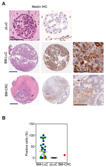 Immunophenotypic characterization of BM-LuC for the neural marker Nestin. (A,B) Nestin immunohistochemistry (IHC) was performed in an independent series of archival BM from lung (n = 41; blue dots SCC histology, green dots ADCA histology, orange dots NSCLC-NOS histology) or CRC (n = 1) cancers and in five primary LuC. Representative images (A) are shown for a pLuC, BM-LuC, and BM-CRC (scale bar, 100 μm). Nestin expression was quantified in cancer cells and expressed as a percentage of positive cancer cells (B).