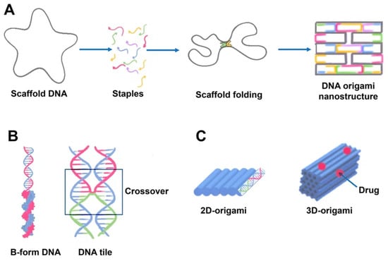 Paul Rotumend introduced the concept of DNA origami technology in 2006. DNA origami is a self-assembling nanostructure in which hundreds of short “staple” oligonucleotides fold a long single-stranded DNA “scaffold” into multilayer DNA assemblies [28]. The scaffold is folded into a predefined form using approximately 200 complimentary short strands (“staples”) by forming crossovers at every DNA helical turn. During thermal annealing, each staple specifically links various scaffold components together according to its own sequence, folding the scaffold into the desired form (Figure 2). The advantage of using DNA origami is concluded in the addressability of specific structural components with subnanometer accuracy and precision by changing individual staples [29].