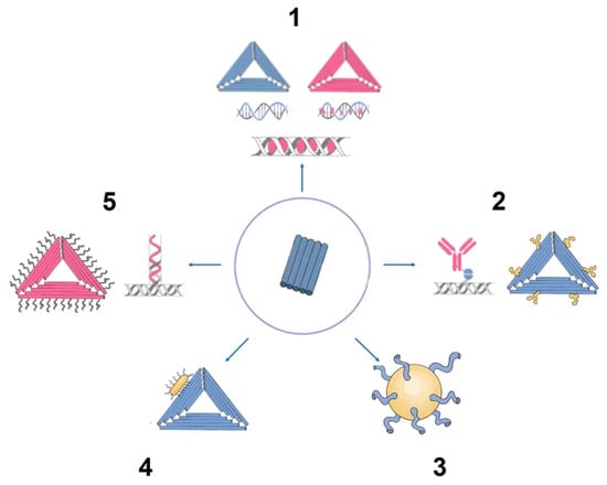 There are now a number of approaches for altering DNA origami structures. All of these techniques are based on the concept of backbone functionalization to obtain reactive end groups (e.g., biotinylation) of backbones and the addition of amino groups to backbones or chains associated with backbone extensions. These chains can be conjugated with other chains that carry drug molecules and nanoparticles [30].