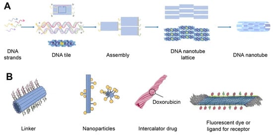 DNA nanotubes are crystalline self-assemblies made of 10 nm-diameter DNA tiles that can grow to tens of micrometers in length. The rigidity of DNA nanotubes is hundreds of times greater than that of double-stranded DNA in general [40]. DNA nanotubes are special 3D structures that have great promise for biomedical applications, such as filament supporting tracks and cargo transporting carriers [41]. Regardless of how they are assembled, DNA nanotubes can have well-defined or indefinite lengths. Single-stranded DNA tiles, multi-crossover tiles, DNA origami, and multi-rung design methodologies for DNA nanotubes are the key assembly techniques. Tile-based motifs have been employed as DNA nanostructure building blocks (Figure 4A) since the 1990s. Recently, single-stranded tile-based 2D and 3D DNA bricks were also developed. Self-assembly of DNA nanotubes is often achieved by heating and cooling mixtures of DNA strands with a given sequence, even though the complexity of DNA nanotubes varies. Importantly, the invention of 3D DNA nanostructure assembly helped the development and use of DNA nanotubes [42]. Typically, DNA nanotubes are created by vertically aligning DNA duplexes into a curved motif, then closing it, or by rolling and cyclizing a two-dimensional DNA origami array [43].