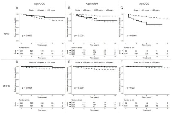 Kaplan–Meier curves according to age groups (AgeAJCC criterion: patients < 55 years old and ≥55 years old; AgeNORM criterion, following statistical division into tertiles: patients ≤ 38 years old, 39–57 years old and ≥58 years old; AgeCOD criterion, following adolescent/post-adolescent classification: patients ≤ 25 years old and >25 years old). (A–C) Recurrence-free survival; (D–F) distant recurrence-free survival. (A–D) Stratification by AJCC age cut-off; (B–E) stratification by tertiles; (C–F) stratification by adolescent/post-adolescent classification.