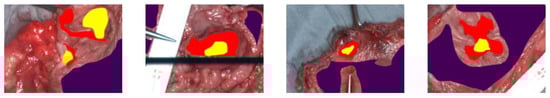 Examples of masks with ground truth labels, where purple is non-malignant tissue, yellow is cancerous, and red is margin of cancerous tissue.