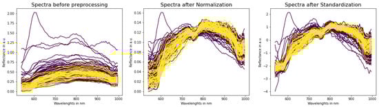 To eliminate the influence of natural spectral differences from patient to patient, we used two spectral scaling methods: Standardization and Normalization (equations are presented in Table 1). Figure 2 presents spectra examples before and after pre-processing techniques.