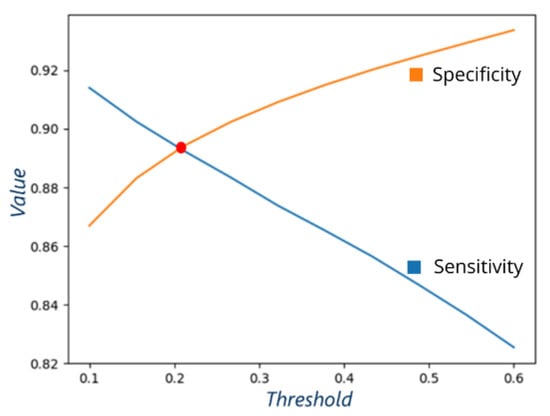 We implemented an algorithm to obtain automatically the optimal threshold value. Increasing the threshold decreases sensitivity and increases specificity (description of metrics in Section 2.5.2). The point of intersection of both curves provides the optimal threshold value (red point in Figure 4). For this example, the intersection point is at the threshold ~0.2, with both sensitivity and specificity at ~0.89.