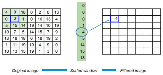 Figure 5 is an example of how the median filter works. Initially, the window size must be defined (on Figure 5 the size is 3: green square). The first step is to pick the window (green square) of chosen size (3) for the chosen pixel (“0” in blue border). The second step is to sort elements in the window (green vector in the middle) and determine the median (in this example, also 22). The last action is to set this value to the corresponding pixel (with the same position as in the original array) in the output array. Odd median filter sizes allow centering the window around the chosen pixel, preserving symmetry and avoiding potential shifts in results.