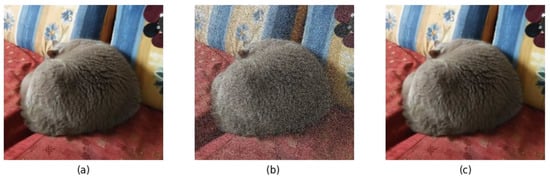 (a) Original image; (b) Original image with added salt-and-pepper noise; (c) Image B after the application of the median filter with window size 5.