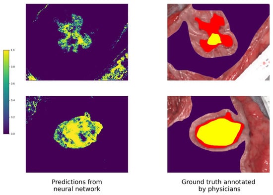Prediction map examples in the left column and ground truth annotated by physicians on the right side, with the correspondence between colors and output probabilities shown on the color bar. Yellow represents cancerous tissue, purple non-malignant tissue, and red the margin of the cancer.