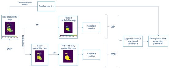The optimal post-processing parameters, MF size and threshold, are automatically computed using the algorithm presented in Section 2.4.4. The post-processing step is evaluated by comparing the metrics (Section 2.5.2) with the baseline metrics obtained without post-processing (Section 2.3.5).