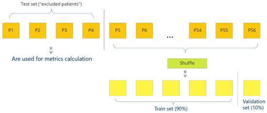 Figure 9 presents a cross-validation. To obtain maximally honest results for a patient (Patient X), at first we exclude this patient fully from the training process. Then, we shuffle samples from other patients and divide samples into a train dataset (90%) and a validation dataset (10%). Then, final metrics are calculated on excluded Patient X with the model that was not trained with the Patient X. Therefore, because the dataset includes the HS images of 56 patients, to evaluate one architecture we need 56 trainings (cross-validation steps) and 56 models, respectively, one for each patient. However, excluding only one patient per training is too time-consuming, so sometimes we exclude four patients at once (in this case, leave-four-out-cross-validation).