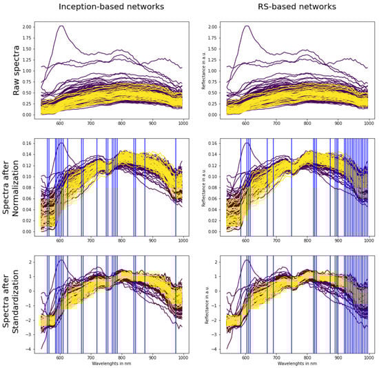 We found that inception-based 3D-CNN models perform better than RS-based ones, but that post-processing improves the results of both. We found that each type responds best to different types of pre-processing: Inception-based networks work better with Normalization and RS-based with Standardization. The reason for this is that each model works best with the corresponding pre-processing type that accentuates the differences in those wavelengths that affect the model’s performance the most.
