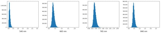 Lack of preliminary analysis (checking if probability distributions is normal) before applying Standardization can cause probability shifts and, as a result, a low discrimination threshold, as we can see on models that use Standardization (Table 6). Traditionally, an activation function of the last layer in binary classification neural networks is a sigmoid function. It converts a raw value from the network to a probability. If the value from the network is large and negative, then the probability will be close to 0. If thresholds are so low, it means that most probabilities are very close to 0, which in turn implies large negative output values from the network. In Figure 2 it can be seen that most spectral values after Standardization are in the range (−3, 1), so most values seen by the networks are negative. We suppose that this particular situation creates an imbalance that causes more negative values and a lot of near-zero probabilities at the end. Figure 11 depicts probability distributions of some wavelengths. As can be seen, they are not normally distributed, especially at the beginning and end of the spectra. This can be a reason for the imbalance, because a precondition for using Standardization is that all wavelengths have to be normally distributed. This opens the next future research directions: (1) an exclusion of outliers before wavelength scaling and (2) application of the Min-Max scaler after Standardization. This would return a standardized spectrum, but in the range 0–1, which could level out the imbalance.
