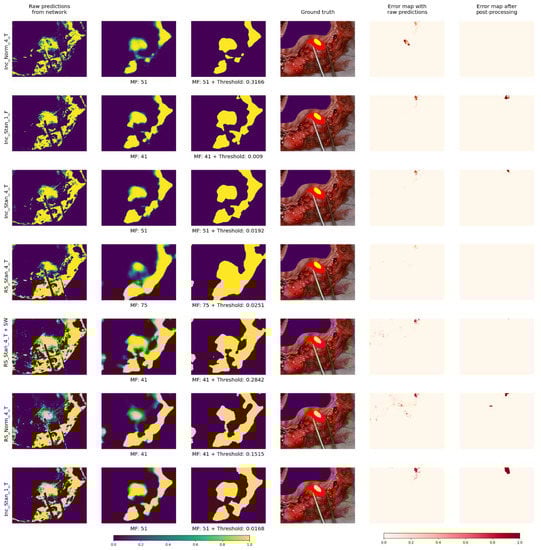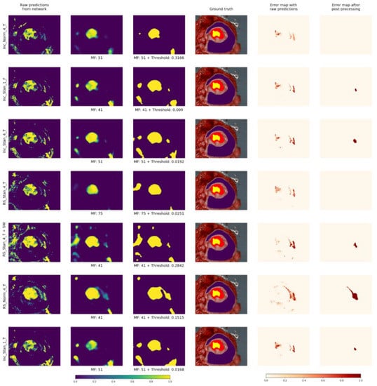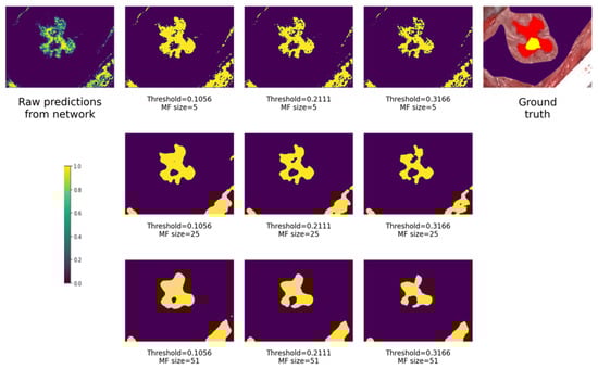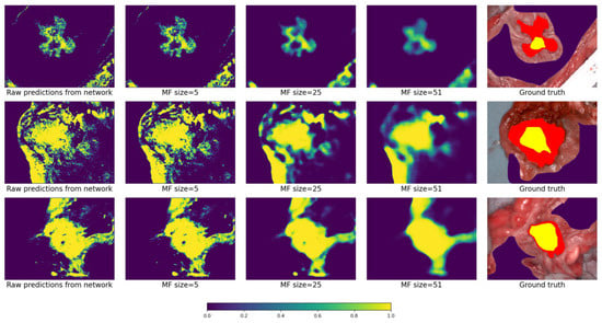Figure 15 depicts how different MF sizes affect the output probability map. Each row corresponds to one patient. From left to right in each row: raw prediction map from the network, predictions after the application of the MF (with sizes 5, 25, 51), and ground truth. As can be seen, with increasing MF size the recognized areas are more packed.