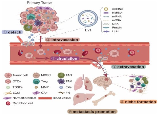Extracellular vesicles (EVs) are lipid bilayer vesicles released from cells, and their bilayer membranes prevent the contents from being degraded by exogenous nucleases and proteases, facilitating the long time and long distance transport of biomolecules [9,10]. EVs lack a functional nucleus and are incapable of self-replication, and are vesicles that are continuously released by cells and that participate in various physiological and pathological processes through the delivery of their cargo [11,12,13,14]. EVs are present in many body fluids, such as blood, urine, and saliva, and can be recognized by their unique biological and secretory mechanisms [15]. In recent years, a lot of research shows that EVs promote PMN formation and distant metastasis by transporting functional molecules, including nucleic acids (e.g., DNA, mRNA and non-coding RNAs (ncRNAs)), proteins (e.g., cytokines, membrane receptors and receptor ligands), lipids, and so on [16,17].