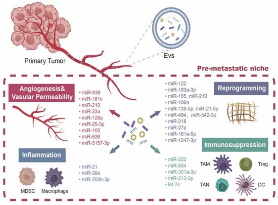 There is growing evidence that ncRNAs carried by EVs can promote tumor-distant metastasis by establishing PMN at distal metastatic sites in multiple ways, including promoting upregulation of inflammatory molecules; induction of immunosuppression; impairment of T cells; NK cell and antigen presentation; increase in angiogenesis and vascular permeability; activation of metabolic reprogramming; and remodeling of stromal cells and the extracellular matrix (ECM) [35,36,37,38].