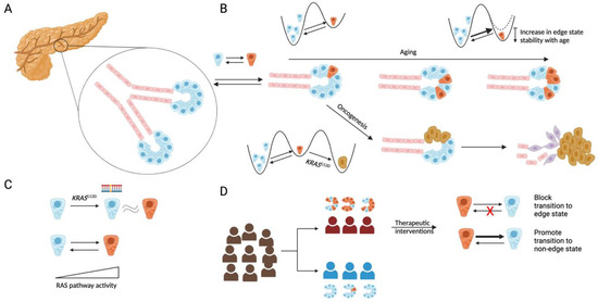 (A) Schematic of the human pancreas, with the exocrine compartment consisting of acinar cells (blue) and ductal cells (red). (B) Acinar cells can switch to an edge state (brown) characterized by low expression of acinar identity genes. The fraction of edge cells increases with age, which may be due to an increased transition rate to the edge state or an increase in the stability of the edge state, or a combination thereof. Cells in the edge state are predisposed to malignant transformation with the acquisition of a KRASG12D mutation, leading to malignancy, with malignant cells existing in different phenotypic states (purple or brown) (C) Edge cells have high Ras activity, and the edge-like state phenocopies (at a transcriptomic level) the KRASG12D mutation in mice. (D) Acinar cells likely exist in an edge state in patients that are at a high risk for PDAC. Therapeutic interventions to block transitions to an edge state, or promote transitions away from the edge state, may lower PDAC risk.
