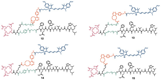 Chemical structures of the four dual-modality probes 12-15. In black, the peptide sequence responsible for binding to the GRPR, and the lysine residue. In green, the PEG4 and pADA linkers. In red, the DOTA chelator. In orange, the inverse electron demand Diels–Alder click reaction, and in blue, the sulfo-cyanine 5 fluorescent dye.