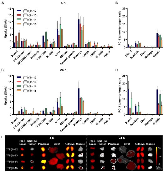 Ex vivo biodistribution of [111In]In-12-15 (20 MBq/1 nmol) in mice bearing GRPR-positive PC-3 and GRPR-negative NCI-H69 xenografts. Radioactivity uptake values are expressed as percentage injected activity per gram of tissue (%IA/g) and as PC-3 tumor-to-organ ratios at 4 h (A,B) and 24 h (C,D) post injection, and represent the mean ± standard deviation (n = 3/4). Ex vivo merged photograph and fluorescence images of a subset of dissected tissues and organs (E) are shown for one representative mouse per group. The fluorescent signal is displayed as average radiant efficiency in p/sec/cm2/sr per μW/cm2.