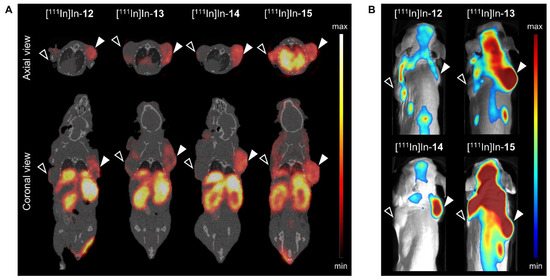 ; left shoulder) tumor-bearing mice at 24 h post injection of [111In]In-12-15 (20 MBq/1 nmol). SPECT/CT images represent an overlay of a CT slice and the corresponding SPECT slice on which the tumor cross-sections are clearly visible. The arrow heads point to the location of the tumor.