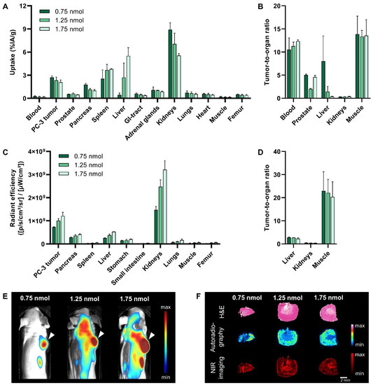 Regarding optical imaging, the fluorescence images showed a strong increase in the fluorescent signal in the tumor upon application of an increasing dose (Figure 4E). The quantification of this signal revealed a 1.7-fold increase for 1.75 vs. 0.75 nmol (p < 0.0001) (Figure 4C, Table S6). However, the fluorescent signal in most background organs also increased, e.g., 2.0-, 2.2- and 1.9-fold higher signal in the liver, kidneys and muscle, respectively, when a dose of 1.75 vs. 0.75 nmol was administered. Together, this resulted in similar T/O for all doses (Figure 4D). Based on this and the better tumor-to-liver ratios of the radioactive signal distribution following the injection of a lower dose, 0.75 nmol was identified as the ideal dose.