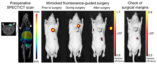 In order to assess the applicability of [111In]In-14 for image-guided tumor resection, image-guided surgery was mimicked on PC-3 and H69 xenografted mice (Figure 5). The GRPR-positive tumor could be clearly localized via a preoperative SPECT/CT evaluation at 24 h p.i. Post-mortem IVIS imaging allowed the location of the incision to be accurately determined and the tumor tissue to be distinguished and monitored during the operative procedure through fluorescent guidance.
