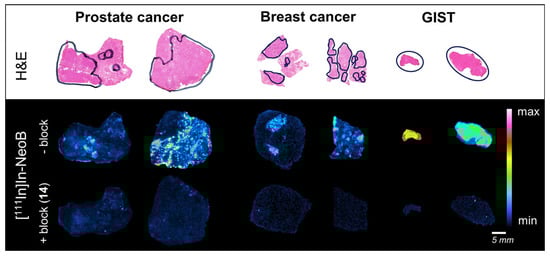 An ex vivo binding study was performed on a wide range of solid cancer specimens (i.e., breast cancer, prostate cancer and GIST) to demonstrate the broad applicability of [111In]In-14. Figure 6 shows that an excess of the dual-modality probe can successfully block the [111In]In-NeoB signal in all three cancer types studied, illustrating its potential to bind to various human GRPR-positive cancerous tissues.