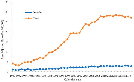 The study analyzed the incidence rates of oral cancers over the period from 1980 to 2019, stratified by age groups ranging from 30–34 to 80–84 years of age and time periods ranging from 1980–1984 to 2015–2019. The birth cohorts were categorized into 18 groups, ranging from the oldest cohort (born in 1900–1904) to the youngest cohort (born in 1985–1989). The age group of 30–34 was chosen as the starting point for the graphs due to the low incidence of oral cancer among individuals under 30 years old. The age-adjusted incidence rates (ASR) were calculated using the 2000 World Standard Population []. To assess the secular trend in oral cancer incidence, the study utilized the National Cancer Institute’s online tool to calculate the average annual percentage change (AAPC) []. Additionally, the study investigated the period and cohort effects on oral cancer incidence through age–period–cohort modeling using the same web tool. This approach provided the rate ratios (RRs) that compared the incidence of oral cancers in different periods (period effects) and cohorts (cohorts) to the reference points []. The relationship between ASR of oral cancer and related risk factors was analyzed using Spearman’s correlation, and statistical analysis was conducted by Microsoft™ Excel™ 365 MSO 16.0.13528.203018 64bit (Microsoft Corporation, Redmond, Washington, WA, USA).