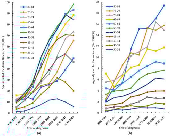 Figure 2a shows the age-specific rates of oral cancer in males per 100,000 men in Taiwan. The age-specific rate of oral cancer in males increased steadily between 1980–1984 and 2015–2019. The relative percent changes were 810%, 717%, 451%, 485%, 449% and 323% in the 55–59, 60–64, 65–69, 70–74, 75–79 and 80–84 age groups, respectively. The 45–49 age group increased to a peak in 2010–2014 and tended to plateau in 2015–2019. The 40–44 and 50–54 age groups showed a trend of rising to decline, with peaks occurring in 2010–2014. The 30–34 and 35–39 age groups showed a trend from rising to declining, with peaks occurring in 2005–2009. Figure 2b shows the age-specific rates of oral cancer in females. The age-specific rate of oral cancer in females stabilized in three age groups (30–34, 35–39 and 40–44) between 1980–1984 and 2015–2019. The age-specific rate of oral cancer in females in five age groups (45–49, 55–59, 65–69, 75–79 and 80–84) increased steadily between 1980–1984 and 2015–2019. The respective relative percent changes were 189%, 129%, 66%, 524% and 811%. The 50–54, 60–64, and 70–74 age groups showed a trend of rising to decline, with peaks occurring in 2010–2014.