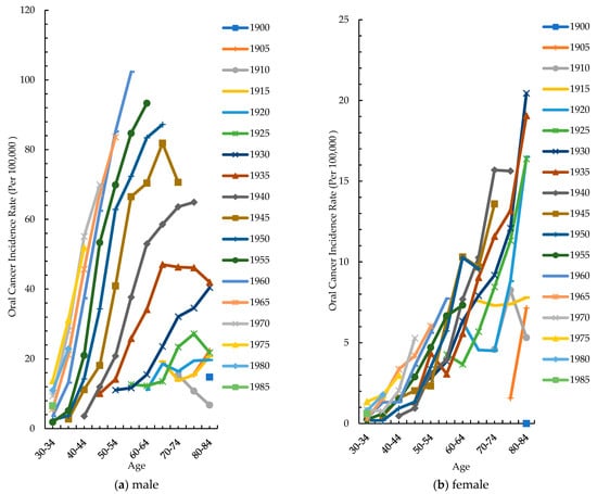 Age-specific incidence rates of oral cancer by birth year: (a) males, (b) females.