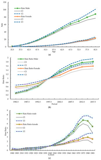(a) Age effect of oral cancer in Taiwan by sex. Age: 32.5–82.5; (b) Period effect of oral cancer in Taiwan by sex. Period: 1980–2019; (c) Cohort effect of oral cancer in Taiwan by sex. Cohort: 1900–1985.