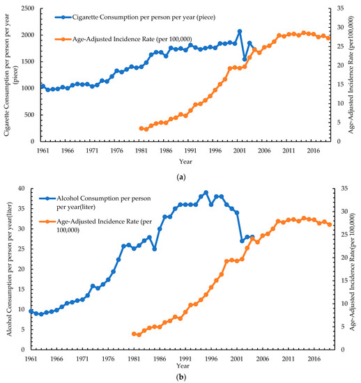 Data on the consumption per person of tobacco and alcohol in this study were retrieved from the Taiwan Tobacco and Liquor Corporation survey [] and the Ministry of Finance, Taiwan [], respectively. Data on the production of betel nuts were obtained from the Council of Agriculture, Executive Yuan, Taiwan [].