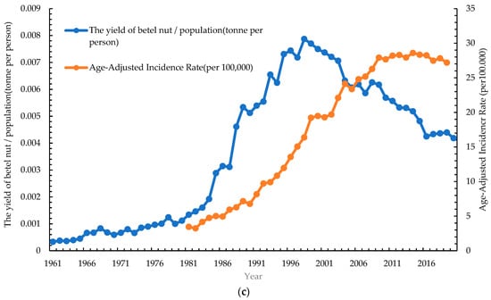 Areca nut is an established cause of leukoplakia, submucous fibrosis and oral cancer []. A previous meta-analysis, including 50 reports, explored the relationship between chewing betel quid and the risk of oral cancer. In the Indian subcontinent, the meta-relative risk (mRR) for oral/oropharyngeal cancer was 2.56 (95% CI = 2.00–3.28) for betel quid consumption without added tobacco and 7.74 (95% CI = 5.38–11.13) for betel quid with added tobacco. In the Taiwan subcontinent, the mRR for oral/oropharyngeal cancer was 10.98 (95% CI = 4.86–24.84) for betel quid without added tobacco []. Arecoline, which is contained in areca nut, may induce DNA damage, which results in oral carcinogenesis []. The possible effect of this is that arecoline could downregulate and inhibit the p53 expression []. Oral submucous fibrosis is a precancerous lesion that has individual susceptibility related to betel quid consumption due to cumulative exposure. Based on PCR-based restriction fragment length polymorphism assays, a comparative study with 166 patients with oral submucous fibrosis and 284 betel quid chewers reported the highest genotypes of oral submucous fibrosis risk for collagen 1A1, collagen 1A2, collagenase-1, transforming growth factor beta1, lysyl oxidase and cystatin C were CC, AA, TT, CC, AA and AA, respectively, in the low-exposure group. In the high-exposure group, the highest genotypes of oral submucous fibrosis risk for collagen 1A1, collagen 1A2, collagenase-1, transforming growth factor beta1, lysyl oxidase and cystatin C were TT, BB, AA, CC, GG and AA, respectively []. According to our study, the production of betel nut peaked in 1978, with an average of 1.242 tonnes of betel nut yield per person, while the incidence rate of oral cancer in men increased from 1980 with a peak of 28.59 in 2014 and gradually tended toward a plateau. In Asia, betel nut products can be classified as either with or without tobacco []. In Taiwan, betel nut without tobacco is more common than with it []. A previous meta-analysis including 19 studies in South Asia and the Pacific reported that betel quid without tobacco also has a serious impact on the risk of oral cancer (OR = 2.82, 95% CI = 2.35–3.40) []. In Taiwan, the prevalence of betel nut chewing among people over 15 years of age was about 8.8–16.1%, and the prevalence in males was larger than in females. A previous comparative study reported that the annual average betel nut consumption per person could account for 86.2% of the variation in the incidence of oral cavity cancer by multiple regression models []. Betel quid consumption seemed to have a cohort effect on oral cancer, and the difference in the trend between men and women may explain the sex differences for oral cancer in Taiwan.