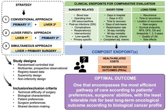 Schematic overview of different approaches for patients with colorectal cancer with synchronous liver metastases and clinical endpoints.
