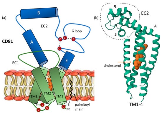 - Zimmerman, B.; Kelly, B.; McMillan, B.J.; Seegar, T.C.M.; Dror, R.O.; Kruse, A.C.; Blacklow, S.C. Crystal Structure of a Full-Length Human Tetraspanin Reveals a Cholesterol-Binding Pocket. Cell 2016, 167, 1041–1051. [Google Scholar] [CrossRef]