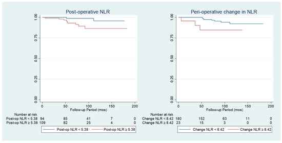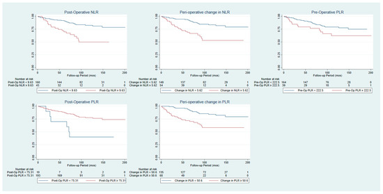 Kaplan–Meier curves comparing overall survival of patients with various cut-offs for post-operative NLR, peri-operative change in NLR, pre-operative PLR, post-operative PLR and peri-operative change in NLR.