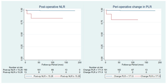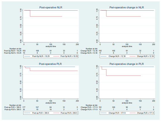 On multivariate analysis, a pre-operative PLR of ≥1.20 was found to have significantly better MFS. However, patients with a post-operative PLR (cut-off of ≥127.8) or increased peri-operative change in PLR (measured continuously or by a cut-off of ≥171.9) is associated with significantly worsened MFS (Table 8).