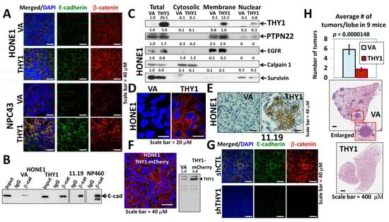 THY1 is involved in maintaining adherens junctions in NPC. (A) IF staining of β-catenin and E-cadherin in the HONE1 and NPC43 THY1 transductants. VA, vector-alone. (B) Formation of the E-cadherin-β-catenin complex in the THY1-expressing cells. Input stands for total lysate without antibody pulldown. (C) Expression of proteins of interest in the cytosol, membrane, and nuclear fractions of THY1 transductants. (D) IF staining of THY1 (red) in transplanted THY1 transductants. (E) IHC staining of THY1 in transplanted THY1 transductants (small tumor). (F) The fluorescent signal of the THY1-mCherry fusion protein in HONE1. Western blot analysis of THY1-mCherry in HONE1 was also shown. (G) IF staining of β-catenin and E-cadherin in the THY1 shRNA (shTHY1) knockdown clone of HK11.19. shCTL, control shRNA. (H) The results of the lung metastasis assay of the THY1 transductants. Representative H&E staining of a single lobe of a lung from the THY1 and VA transductants.