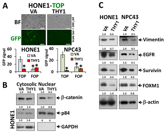 THY1 reduces the level of cytosolic β-catenin and inhibits the Wnt signaling pathway. (A) Representative results of TOP/FOP-FLASH assay (top photo) and statistics of the TOP/FOP-FLASH assay in HONE1 and NPC43 cells. Wnt signals are reflected by average GFP intensities in HONE1 and NPC43 with forced expression of THY1. *: p < 0.05 compared with VA-TOP; VA, vector-alone. (B) Western blot analysis of nuclear and cytosolic β-catenin in THY1 tranductants. (C) Western blot analysis of the EMT and Wnt target proteins in THY1-expressing cells.