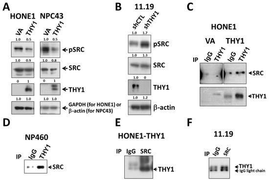 To elucidate whether the previously reported binding target of THY1, SRC, was involved in the THY1-mediated tight adherens junctions in NPC cells, the phospho-SRCY419 (the active form of SRC) expression in THY1 transductants were studied. Results clearly showed that SRC activation could be suppressed by the presence of THY1 in both HONE1 and NPC43 cell lines (Figure 3A). When THY1 was depleted in HK11.19 cells, the expression of phospho-SRCY419 was increased (Figure 3B). The SRC activities were inversely associated with the THY1 expression in NPC cells. Interestingly, the co-IP assay results showed that THY1 could physically interact with SRC in NPC cells (HONE1, HK11.19) and immortalized NP460 cells (Figure 3C–F), which is in agreement with the observation in other cell types [26,27]. Taken together, these data support the hypothesis that THY1 can inhibit the activation of SRC in NPC cells.