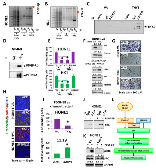PTPN22 is essential for THY1 to inhibit SRC activation. Coomassie staining of immunoprecipitated and total lysates of cell lines as indicated. Arrows indicate (A) PDGF-Rβ and (B) PTPN22, identified by mass spectrometry and validated with co-IP. The interaction of THY1 with PDGF-Rβ and PTPN22 were verified with co-IP analysis in HK1 cells in (C), and NP460 cells in (D). (E) Chamber invasion assay for SRC and PTPN22 siRNA depletion in HONE1-VA, HONE1-THY1, HK1-VA, and HK1-THY1 cells. *: p < 0.05. (F) Western blot analysis of SRC and PTPN22 in siRNA knockdown cells. (G) Representative images of the invaded HONE1-VA and HONE1-THY1 cells with SRC or PTPN22 knockdown. (H) IF staining of adherens junctions (merged images of green E-cadherin and red β-catenin) for cell lines described in Figure 4G. (I) Chamber invasion assay using PDGF-BB as a chemoattractant for HONE1-VA and HONE1-THY1 cells, HK11.19 and THY1-knockdown HK11.19 cells. *: p < 0.05. (J) Co-IP analysis of phospho-SRC in the presence of PDGF-BB in HONE1. (K) Western blot analysis of pSRC (Y419) and total SRC in THY1-expressing cells in response to PDGF-BB. (L) Schematic illustration of how THY1 can regulate EMT and SRC activity through the interaction with PTPN22 and PDGF-Rβ.