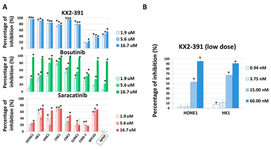 NPC cells or immortalized NP69 cells were seeded in 96-well for 24 h. Cells were then treated with KX2-391, bosutinib, and saracatinib at concentrations of 1.9, 5.6, and 16.7 μM for 3 days. For low concentration treatment of KX2-391, 0.94–60 nM of the drug was used to treat the cells for 3 days. After treatment, the original medium was removed, and cells were incubated with a solution of MTT (working concentration 0.5 mg/mL, in 100 μL complete medium) at 37 °C for 3 h. Then, 70% of the medium was carefully removed, DMSO (100 μL) was added, and the plate was shaken for 30 min to solubilize the formazan produced by living cells. The optical densities were measured, and the percentage of inhibition compared to control was calculated.