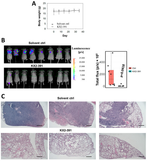 KX2-391 inhibits the lung metastasis of NPC cells. (A) The body weight of the mice in the treatment with KX2-391 was analyzed. (B) The infiltrated HONE1 cells in the lungs were reflected by the bioluminescence signals in the nude mice (n = 8). The luminescence readings from all the mice were presented as a box plot, and each data point was shown. (C) Representative H&E staining of the mouse lungs (Scale bar, 2 mm).