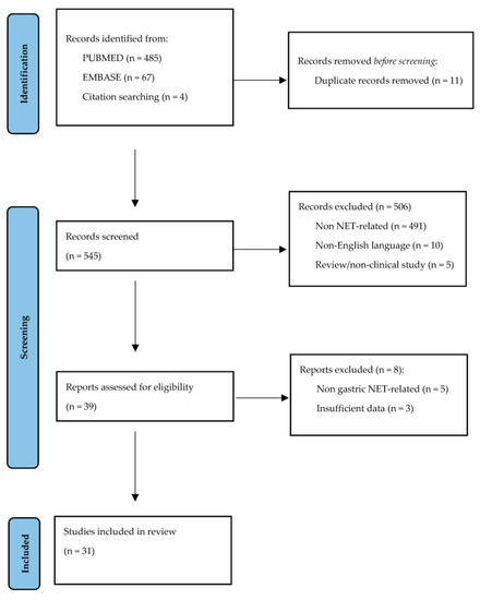 Chicago/Turabian StyleLaffi, Alice, Andrea Gerardo Antonio Lania, Alberto Ragni, Valentina Di Vito, Alessia Liccardi, Manila Rubino, Franz Sesti, Annamaria Colao, Antongiulio Faggiano, and on behalf of the NIKE Group. 2023. "Gastric Neuroendocrine Tumors (g-NETs): A Systematic Review of the Management and Outcomes of Type 3 g-NETs" Cancers 15, no. 8: 2202. https://doi.org/10.3390/cancers15082202