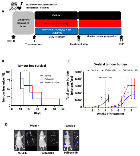 As the schedule which included a 2-day break between palbociclib cycles did not halt tumour progression in bone and in light of the short half-life of palbociclib in mice (1.5–2 h compared to 27 h in humans [39]), we next investigated the effect of daily palbociclib treatment for 4 weeks, commencing 3 days after tumour cell injection (Figure 4A). Patients with bone metastases are commonly treated with the anti-resorptive agent zoledronic acid (Zol) to inhibit tumour-induced bone destruction [40]. We therefore included a third group of animals which were treated with 100 µg/kg Zol once a week, in addition to daily palbociclib, for four weeks. We also followed tumour growth for up to 4 weeks after the end of treatment, to determine the duration of any treatment effects. As shown in Figure 4B, daily administration of palbociclib resulted in a significant inhibition of skeletal bone tumour progression throughout the 28-day treatment period, compared to the vehicle-treated animals (p < 0.005), with no drug-related adverse effects observed (Supplementary Figure S3). During the treatment period, tumour burden was significantly lower in animals that received palbociclib, either alone or in combination with Zol, compared to the vehicle group (Figure 4C). During the treatment period, palbociclib reduced tumour growth in bone to such an extent that it could not be further reduced by addition of Zol. Palbociclib-treated animals that did not exhibit detectable hind limb tumours when imaged in vivo did display micro-metastases detectable by ex vivo imaging of isolated hind limbs (Figure 4D). On day 31 of the study, we withdrew palbociclib (±Zol) treatment and continued to monitor tumour growth. We observed an increase in detectable tumours in palbociclib (±Zol) treated animals within 10 days (Figure 4C). However, compared to animals receiving palbociclib alone, there was a trend towards reduced tumour growth in animals treated with a combination of palbociclib and Zol in the 4 weeks following cessation of palbociclib treatment. These data show that in our TNBC model, continuous daily treatment with palbociclib is required for the inhibition of overt tumour growth in bone. Though not statistically significant in our data, the trend suggests that Zol may contribute to suppressing aggressive tumour growth in bone following cessation of palbociclib +Zol combination therapy.