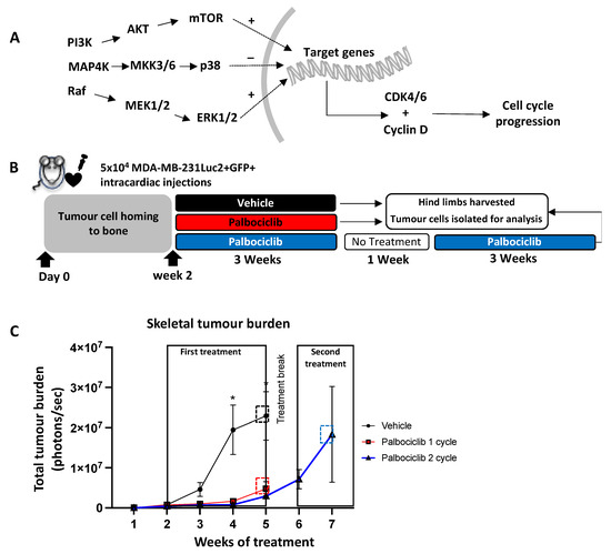 Palbociclib inhibits established metastatic tumour growth in bone, but growth continues after a treatment break. (A) Proteins involved in the MAPK pathway activate their downstream targets by phosphorylation. This leads to the translocation of specific phosphoproteins that activate target genes which in turn promote the production of cyclin D and CDK4/6 resulting in cell cycle progression and survival. (B) Schematic outline of the experiment. Mice were injected with 5 × 104 MDA-MB-231Luc2+GFP+ cells via the intracardiac route. Treatment with 100 mg/kg palbociclib or vehicle commenced on day 14 and continued for 21 consecutive days, followed by a 7-day break before a second cycle of daily palbociclib treatment commenced. (C) Tumour burden in each treatment arm (n = 8 per group, * p < 0.05; multiple t-test) (D) FACS gating strategy for the isolation of GFP+ tumour cells from whole bone and bone marrow, and downstream phosphoprotein array.