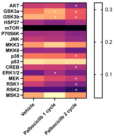 The effect of one- and two-cycles of palbociclib treatment on the MAPK pathway. Heatmap showing the levels of phosphoproteins from tumour cells isolated from vehicle-, one-cycle palbociclib- and two-cycle palbociclib-treated animals. Expression levels measured as band intensities (* p < 0.05 compared to vehicle, + p < 0.05 compared to palbociclib 1 cycle).