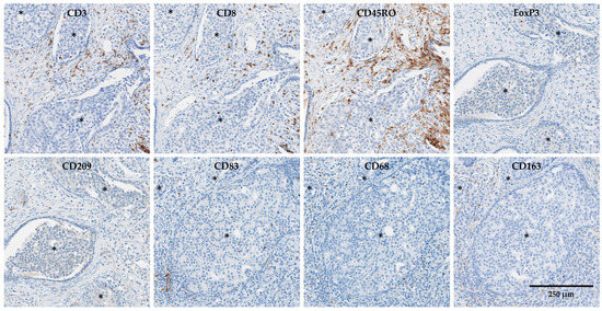 Example of immunohistochemical staining for CD3, CD8, CD45RO, FoxP3, CD209, CD83, CD68 and CD163 in cancer, including intraductal carcinoma of the prostate (IDC-P, asterisks), of the same tissue block. Scale bar: 250 μm.