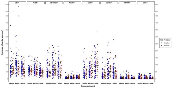 The average cell densities (mean number of positive cells per mm²) ranged from 3 to 836 for CD3, 4 to 163 for CD8, 1 to 238 for CD45RO, 0 to 45 for FoxP3, 1 to 335 for CD68, 0 to 280 for CD163, 0 to 59 for CD209 and 0 to 40 for CD83 (Figure 2). The cell densities tended to be higher in the margins compared to the benign and cancer compartments, except for the CD68⁺ macrophages, which tended to be more abundant in the cancer compartment and the CD83⁺ dendritic cells in benign tissues (p > 0.05). Furthermore, no significant differences were seen in the mean ranks of the immune cells between the IDC-P-negative and the IDC-P-positive samples in the same compartment, excluding the FoxP3⁺ cells, which were more abundant in the margins of the IDC-P-positive samples (mean ranks: 55.0 vs. 41.0, U = 608, p = 0.016) (Figure 2).